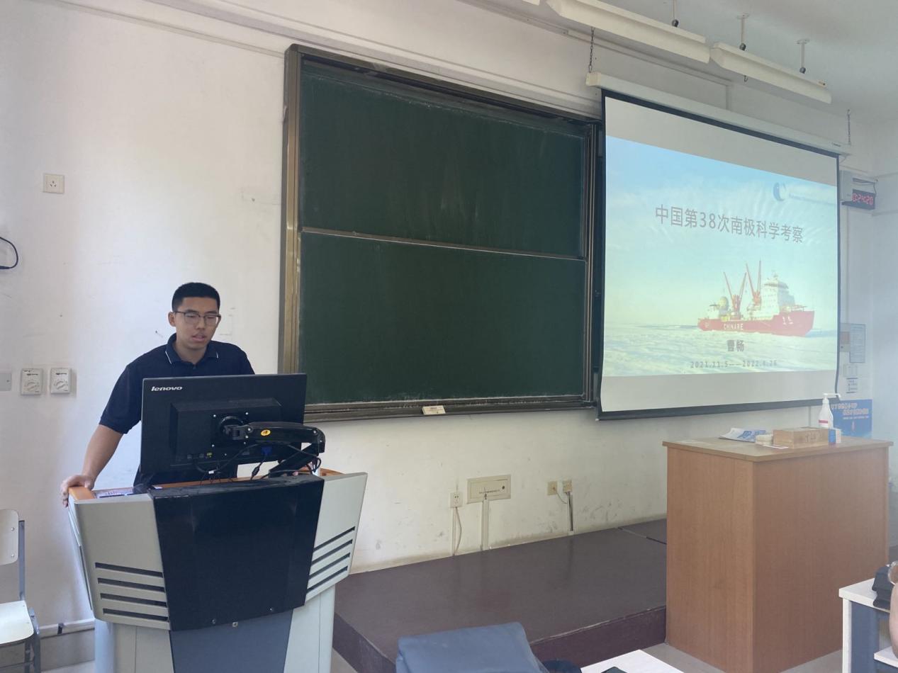 2019级渔业资源博士研究生田浩介绍了“海男”远洋调查团队在西北太平洋从事渔业调查工作中的工作情况与工作经验,同时也向同学们介绍了渔业海洋学实验室的研究背景和研究方向及其自身渔业遥感研究方向的研究背景,进一步促进了同学们对水产学院实验室的了解。2020级渔业资源博士研究生曹畅、2021级渔业资源博士研究生王业辉和2020级捕捞学硕士研究生王鹏浩分别对乘坐“雪龙号”和“雪龙2”号基地破冰船参加第38次中国南极科学考察经历进行分享,用生动的图片及视频资料向同学们展示了海上科研的艰辛以及丰富多彩的海上生活及大洋风景,使同学们对严肃与欢乐并存的海上科研生活有了更进一步的认识。同时学长们对同学们提出的关于如何进入南极科考队以及何时确立自己的科研方向等问题进行了细致的回答,大家受益良多,收获颇丰。