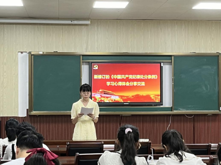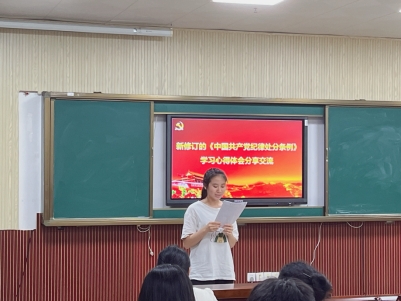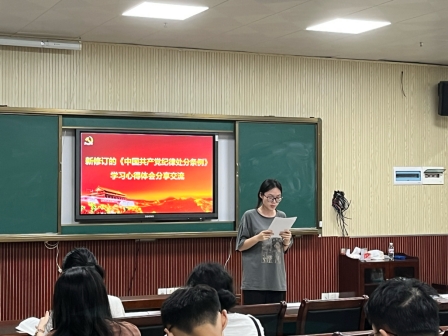 随后,支部3位党员同志依次进行新修订的《中国共产党纪律处分条例》学习心得体会分享。陈举懿同志提出,通过学习新修订的《条例》,进一步增强了自身的纪律观念和政治意识,在今后她将坚持党的领导,紧跟党的步伐,自觉向优秀的党员同志看齐,弘扬党组织优良的纪律作风。黄嘉琪同志谈到,在学习《条例》后,她深刻认识到党的纪律不仅是党生存和发展的根本保障,更是每一位党员必须严格遵守的行为准则,她将以党纪学习教育为契机,深刻反思自身不足,努力做到学纪、知纪、明纪、守纪。侯青青同志指出,我们党从建立那一天起,就把清正廉洁作为必备的政治品格标注在自己的旗帜上,必须把纪律规矩摆在最高处、挺在最前面,大学生党员应该正确处理公私、义利、是非、得失的关系,用自己的言行阐释共产党人的内涵。