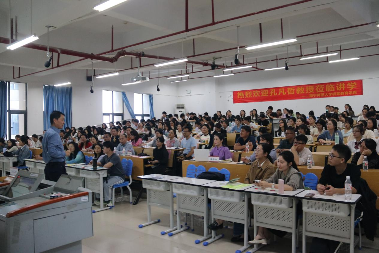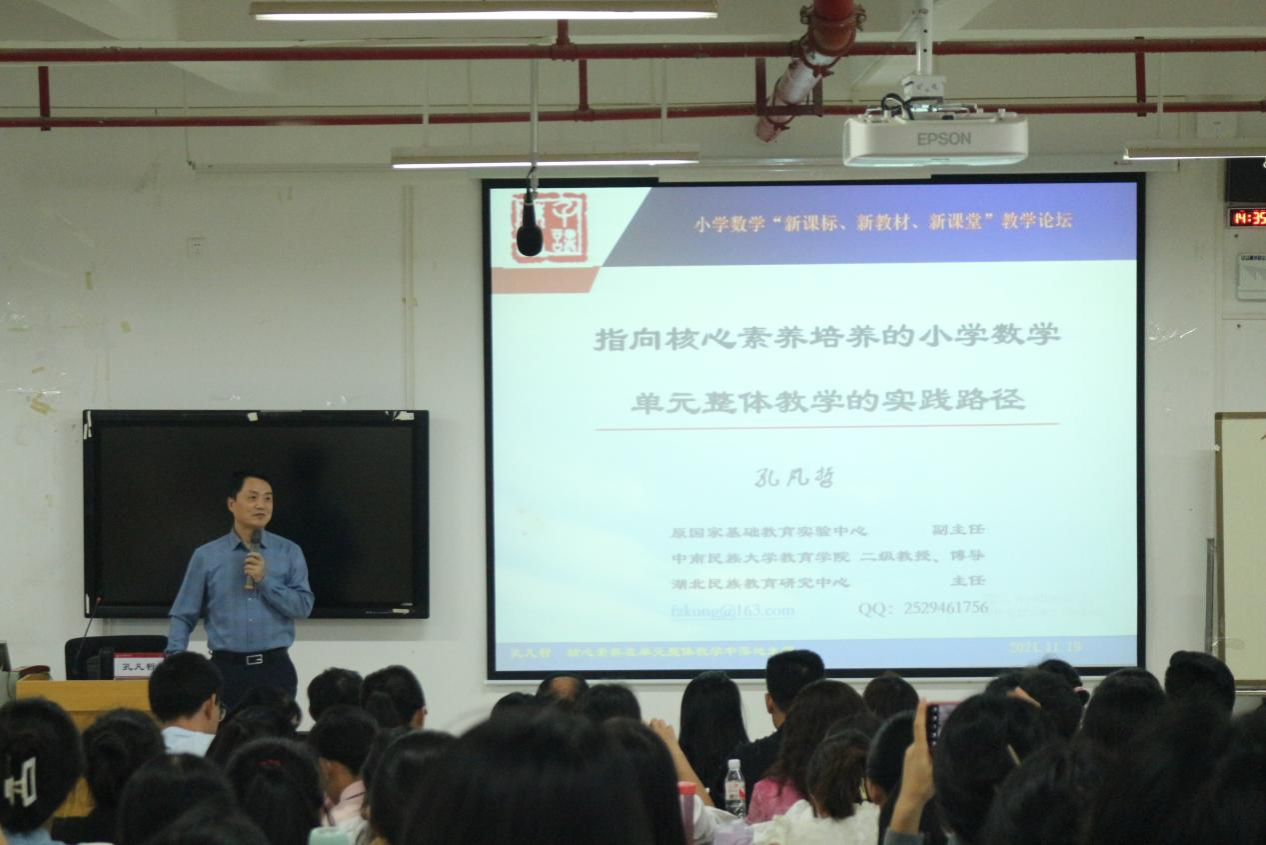 特邀中南民族大学孔凡哲教授到校作《指向核心素养培养的小学数学单元整体教学的实践路径》学术讲座。讲座由学院副院长卢锦珍教授主持,200多名师生以及南宁市20多位小学数学教师参与。
