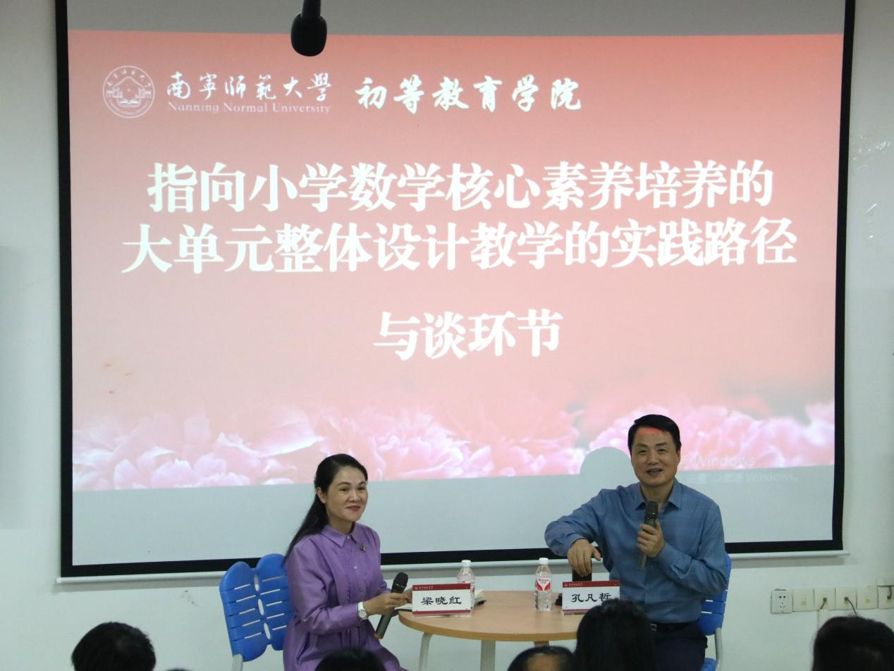 教授、全国模范教师、广西特级教师梁晓红老师,就小学数学单元整体教学的实施、新教材的使用以及师范生综合素养提升等话题,与孔教授展开了深入而富有启发性的交流;在互动环节,孔教授围绕在座的师范生和小学教育工作者如何提升个人核心竞争力,分享了多条宝贵建议。讲座在学院荣退教师、广西民办教育协会法人代表兼秘书长陈寿强的精彩致辞中落下帷幕。