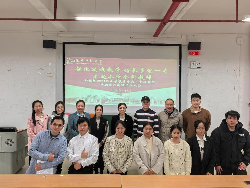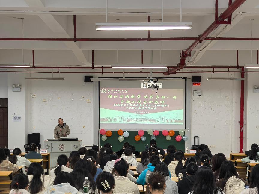 在五合校区文综楼401教室召开以“强化实践教学,培养多能一专卓越小学全科教师”为主题的2021级小学教育专业(全科)毕业实习总结大会。学院梁宇院长、苏学权副书记,全科系刘飖主任、陈陆健副主任,教学秘书潘小红、辅导员秦晴和李露露以及2021级全体全科学生参与会议。