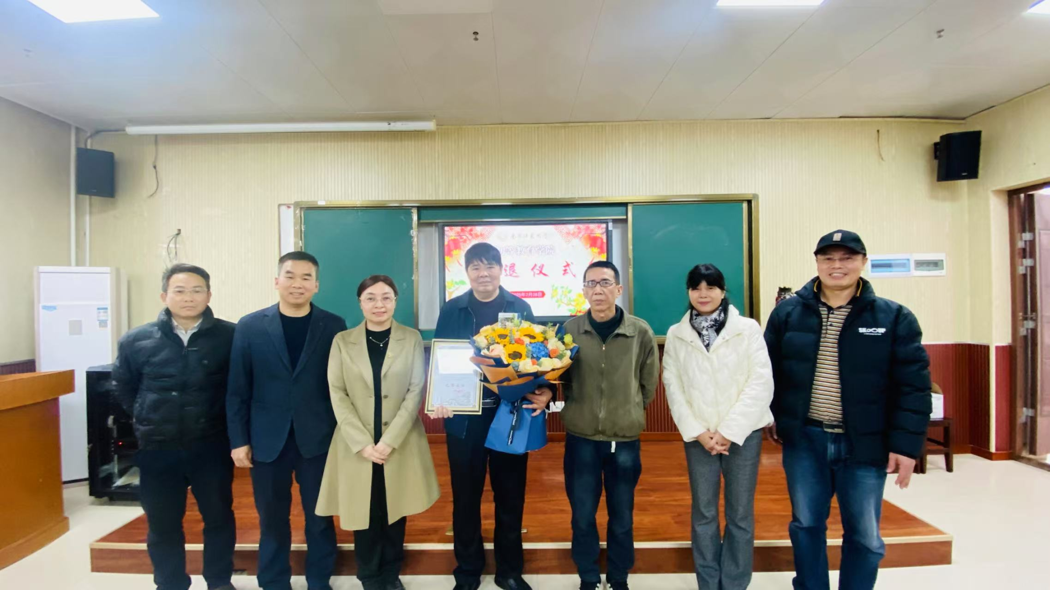 仪式的最后,青年教师代表李美旋老师和向燕老师为卢长召老师献上了鲜花。在鲜花与掌声中,参会老师们纷纷争相与卢老师进行合影留念,将这一刻温馨和谐的美好永远定格。
