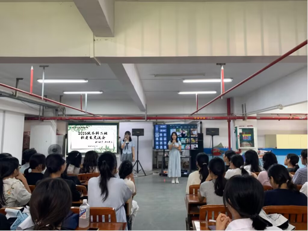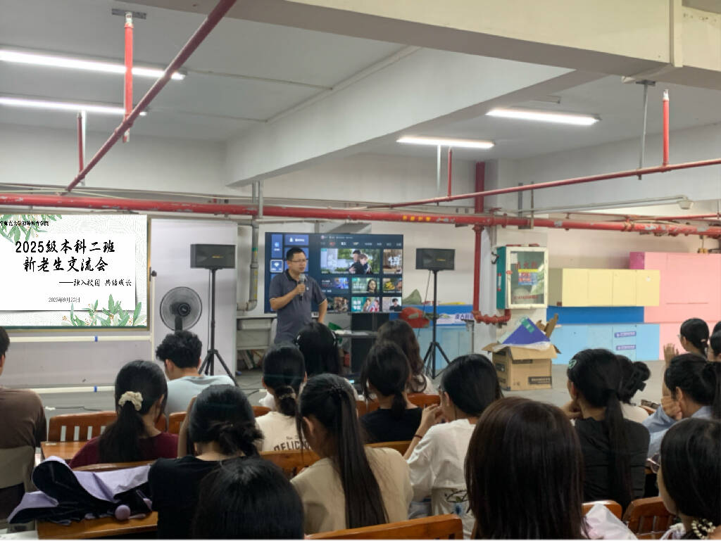 2025级本科二班在五合校区劳动吧召开新老生交流会。班主任谢廷建老师、2023级学生代表、向日葵艺术团部分成员以及25本二班全体同学共同参加了本次交流会。