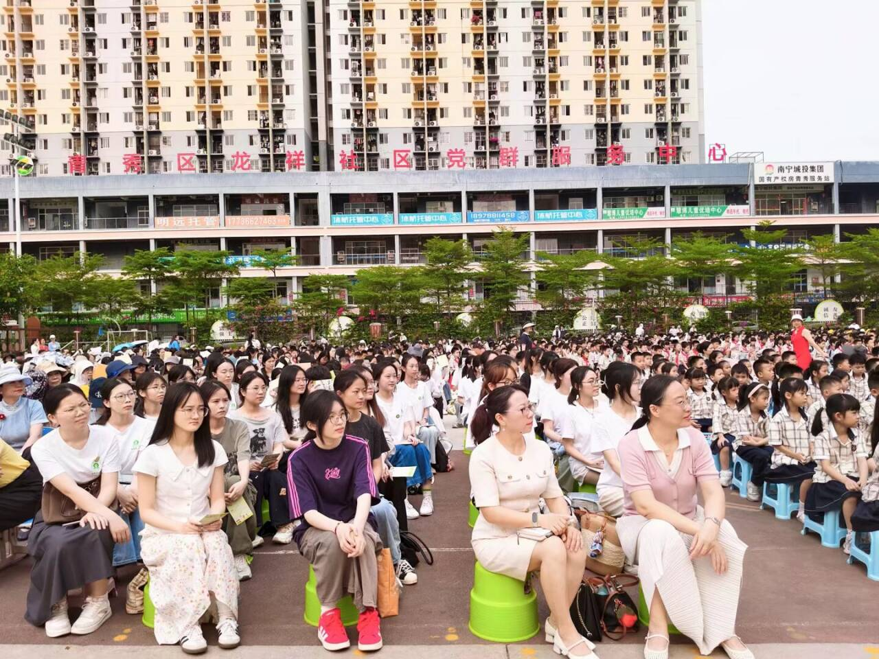 2023级、2024级陶行知实验班及19名研究生学子,在李丹、刘冬梅、韦宵爱、刘飖老师带领下,走进南宁市盘古路小学,参与第二届“谷雨花繁润汉字 字理寻根育童心”谷雨汉字文化节研学活动。