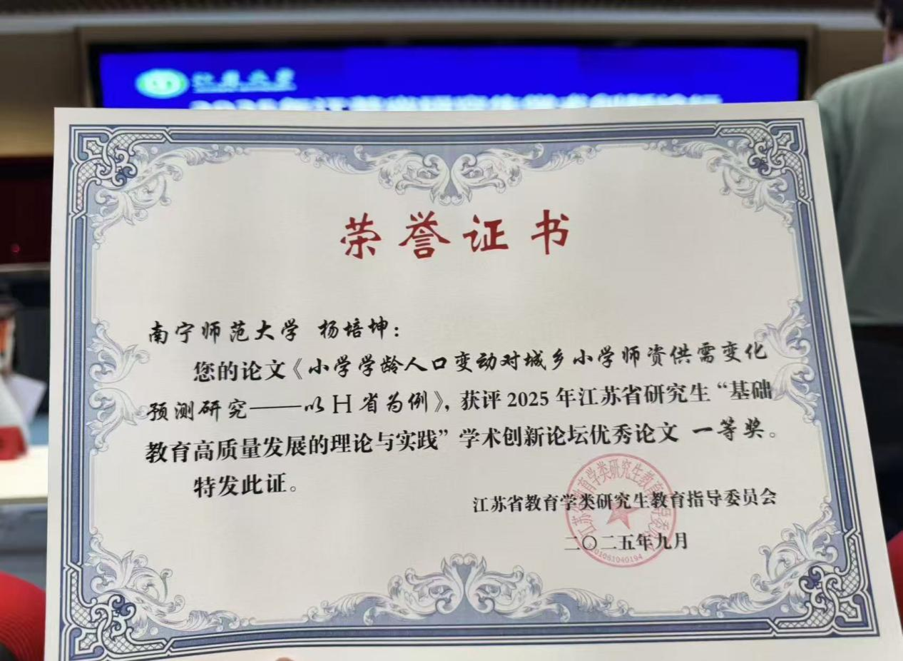 2024级小学教育专业研究生杨培坤提交的学术论文《小学学龄人口变动对城乡小学师资供需变化预测研究——以H省为例》,在植子伦副教授的指导下,经权威专家多轮评审,从众多参赛论文中脱颖而出,荣获“基础教育高质量发展的理论与实践”主题论坛优秀论文一等奖,展现了日韩av