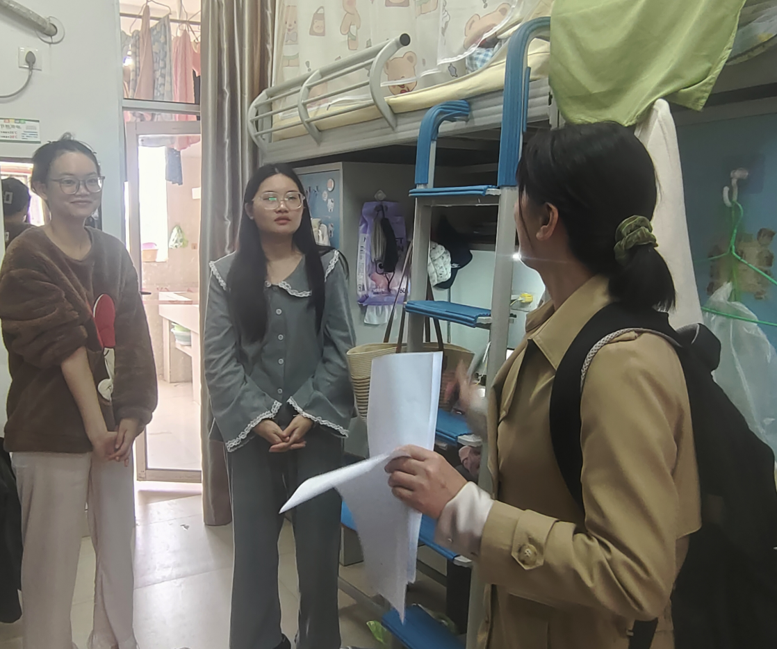 副院长卢锦珍、辅导员覃诗雅实地走访学院研究生宿舍,对宿舍安全隐患进行排查。