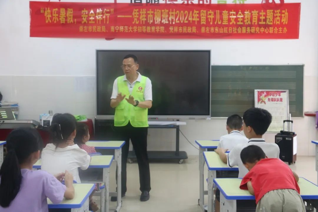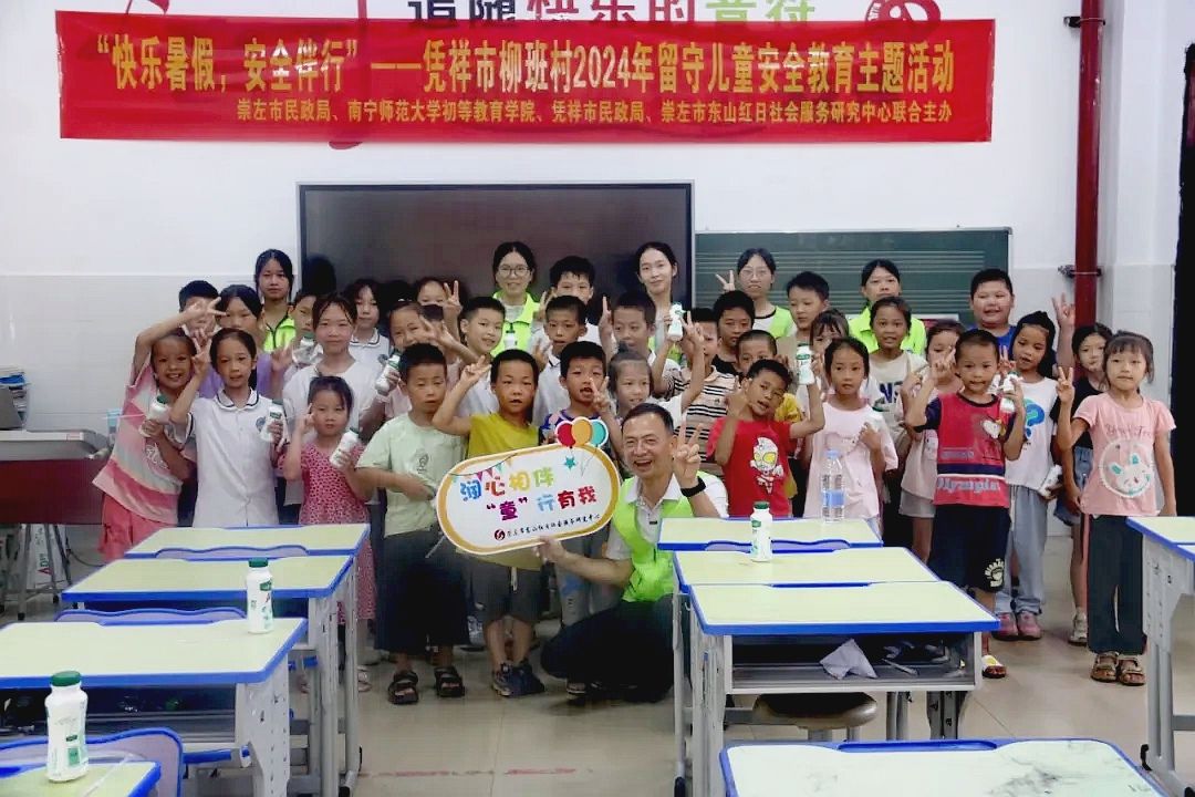 暑期“三下乡”实践队与崇左市民政局、凭祥市民政局及崇左市东山红日社会服务研究中心在柳班小学联合举办了“快乐暑假,安全伴行”柳班村留守儿童安全教育主题活动。
