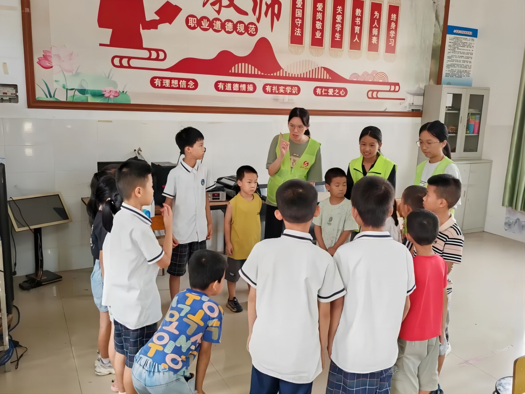 活动伊始,实践队队员们结合《崇左市农村留守儿童关爱保护条例》的相关内容,通过播放视频、图文讲解、互动游戏等方式深入浅出地向小朋友们普及了留守儿童生活、教育、安全等方面享有的合法权益。随后,队员们围绕防溺水和防校园欺凌两个主题开展安全教育,通过案例分析、知识抢答、小组讨论等寓教于趣的形式,向孩子们讲解了相关的安全知识,促进小朋友掌握游泳的注意事项与溺水时的施救措施,增强小朋友对对校园欺凌的认识和警觉性,提升防范校园欺凌,保护自己,保护他人的能力。