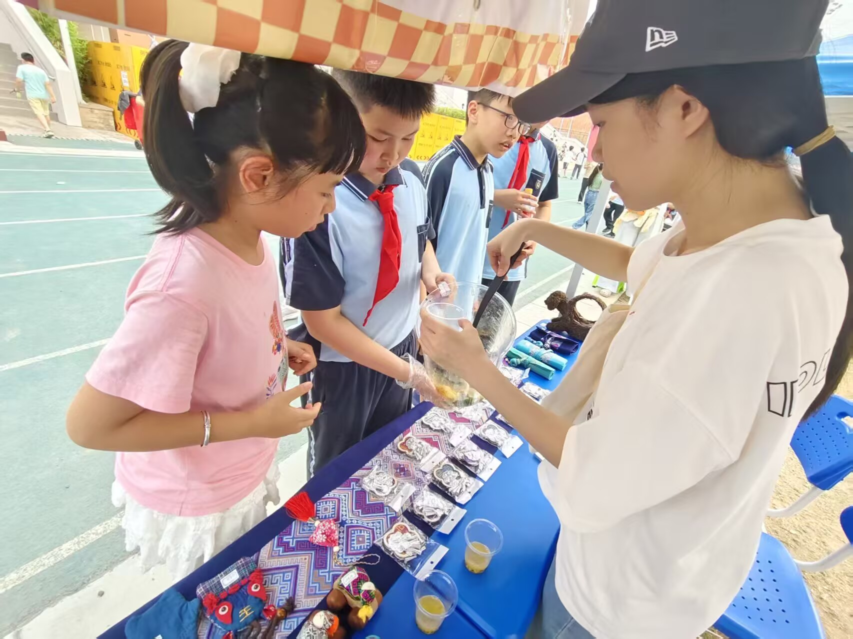 师范生党员带领非遗队员搭建体验摊位,重点开展非遗扎染、香囊制作、漆扇等特色活动。小学生们踊跃参与,在党员志愿者的耐心指导下,亲手折叠、捆扎布料,浸染染料,缝制香囊,绘制漆扇,沉浸式感受非遗技艺的独特魅力,一件件充满童趣的作品陆续诞生,欢声笑语回荡在校园中。