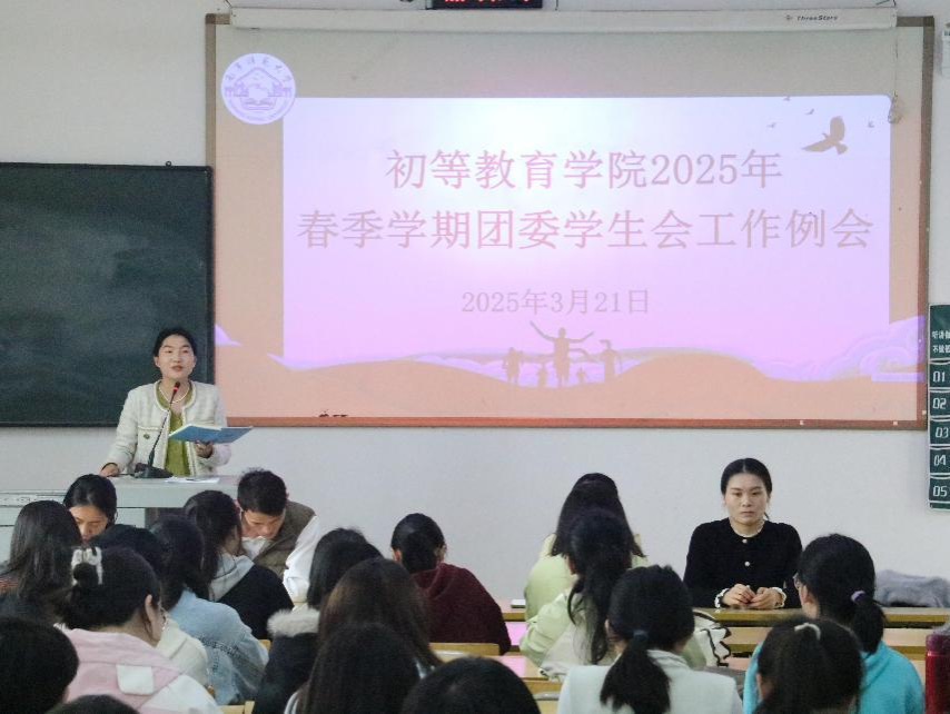 在五合校区五综210教室召开2025年春季学期团委学生会工作例会。学院团委书记李欣,学工办辅导员、兼职辅导员以及团委学生会全体成员参加会议。