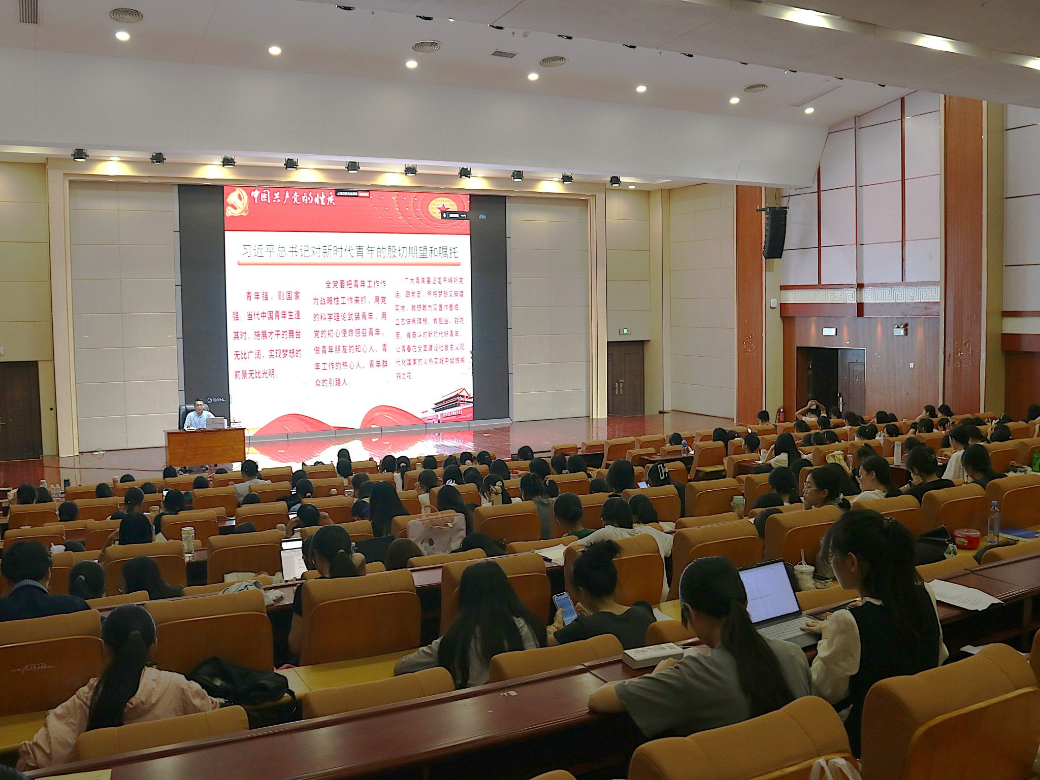 课上,陆书记以习近平总书记对新时代青年的殷切期望和嘱托作为导入,通过回顾党史,从党的诞生、奋斗历程和历史经验中汲取智慧和力量,引导同学们深入理解中国共产党的性质和入党的条件,端正入党动机,以正确的思想为指南,勇于实践、奋发有为。最后,陆书记号召同学们牢记习近平总书记的嘱托,摒弃“骄娇”二气、不做“躺平”“摆烂”青年,不负韶华挺膺担当,为实现国家富强、民族振兴、人民幸福贡献自己的青春力量。