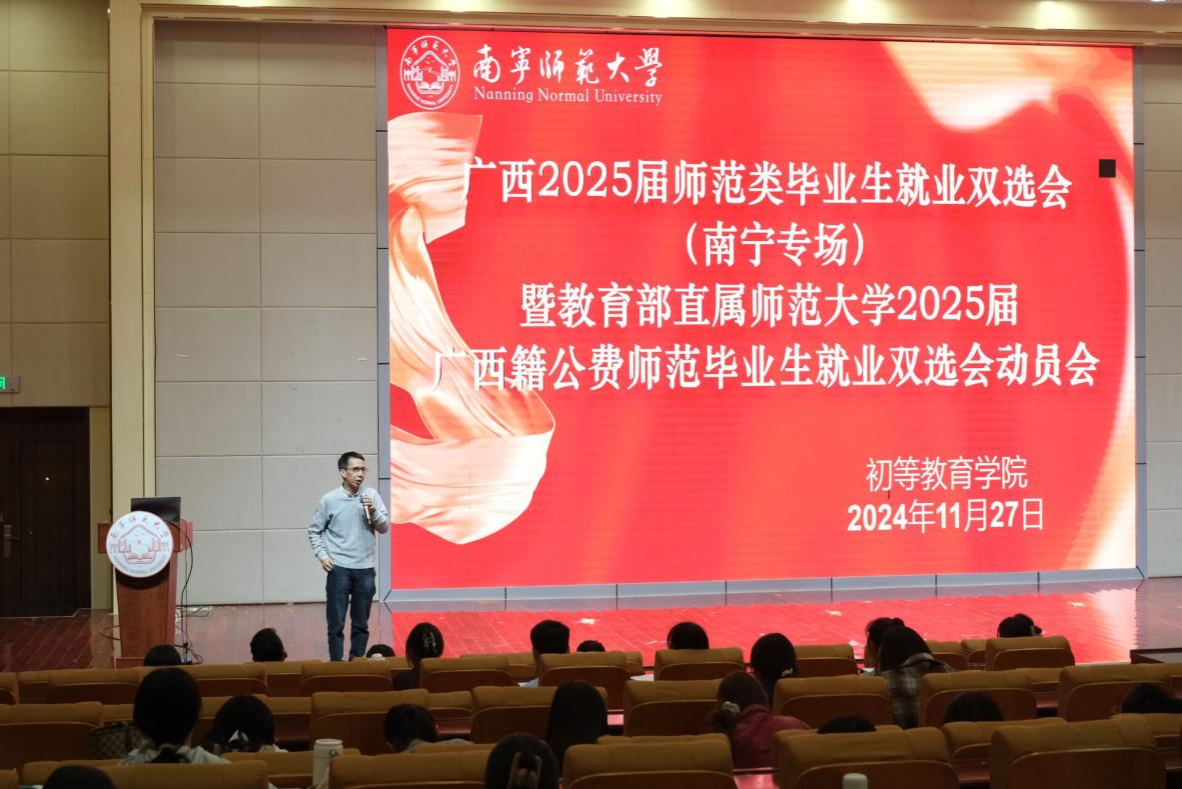 11月27日下午,日韩av 在五合校区文理综合楼114报告厅召开广西2025届师范类毕业生就业双选会(南宁专场)暨教育部直属师范大学广西籍2025届公费师范毕业生就业双选会动员会,日韩av 党委书记陆以宏、全体辅导员及2025届毕业生参加会议。
