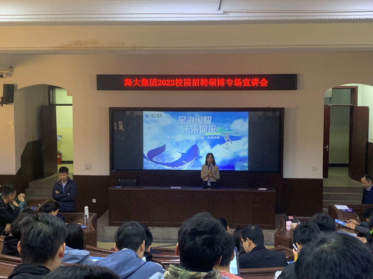 10月19日下午,海大集团2022校园招聘硕博专场宣讲会在中国海洋大学鱼山校区举办,此次宣讲由动保事业部经理主讲,海大集团其他部门经理以及水产学院大批硕、博士研究生参与了此次宣讲会。