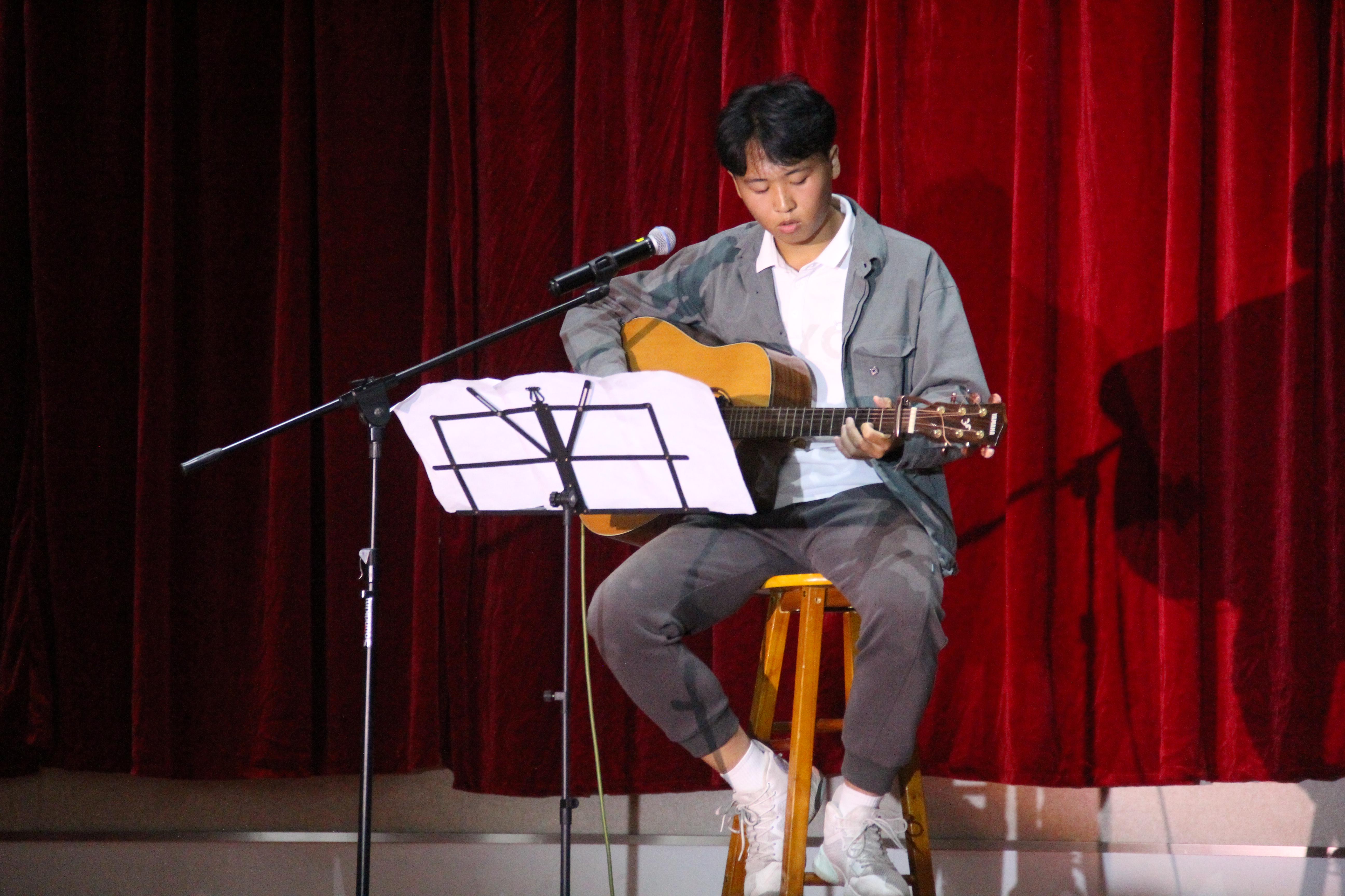 观看了老师们的寄语视频、参与了第二轮小游戏后,最后一阶段的演出拉开序幕。2022级海洋渔业科学与技术班温浩維带来了振奋人心的吉他弹唱《海阔天空》。2023级海洋资源与环境班乐义坤在《Can you feel the love tonight》的演唱中,将童真时代的温馨再现于晚会现场。压轴出场的是《弦连东西》,2023级水产养殖学一班满威麟、刘润辰两位同学带来了专业的小提琴二胡二重奏。