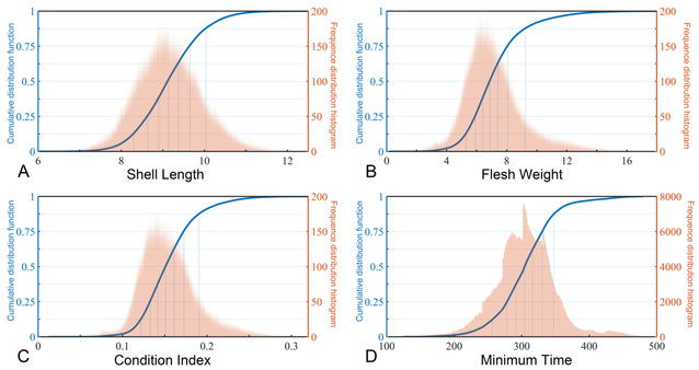 图1 市场化指标(壳长、肉重、肥满度和最短养殖时间)适宜性频数分布和累计分布函数