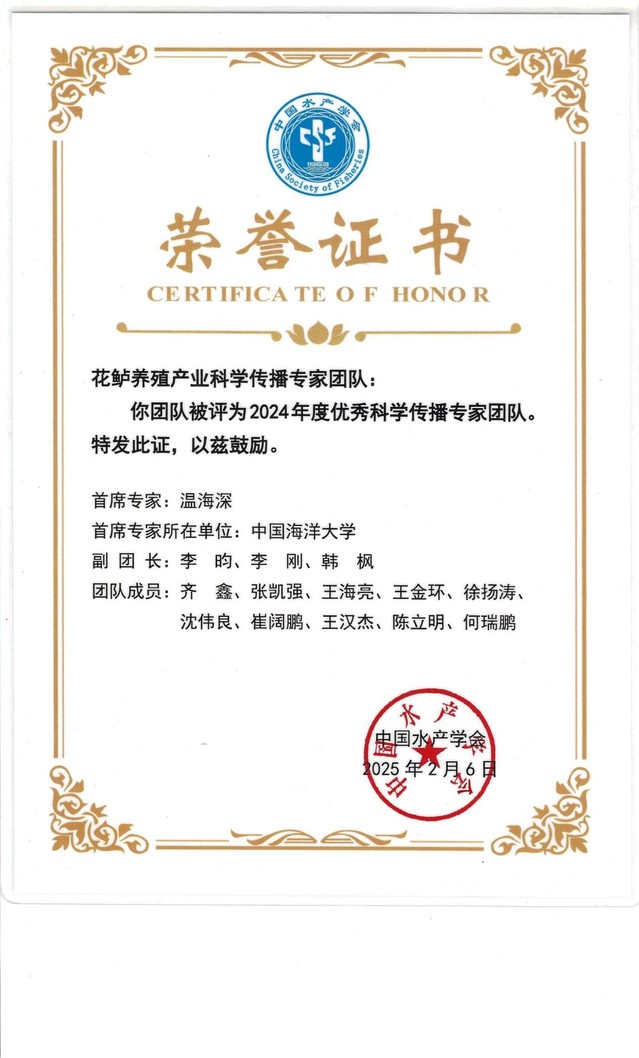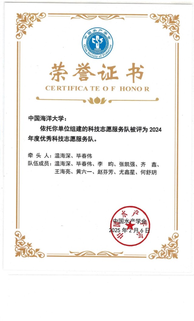 近日,中国水产学会公布了2024年度科普和科技志愿服务工作优秀名单,由水产学院温海深教授任首席专家组成的“花鲈养殖产业科学传播专家团队”获评“优秀科学传播专家团队”,依托水产学院建设的科技志愿服务队被评为“优秀科技志愿服务队”(牵头人温海深教授、毕春伟教授)。