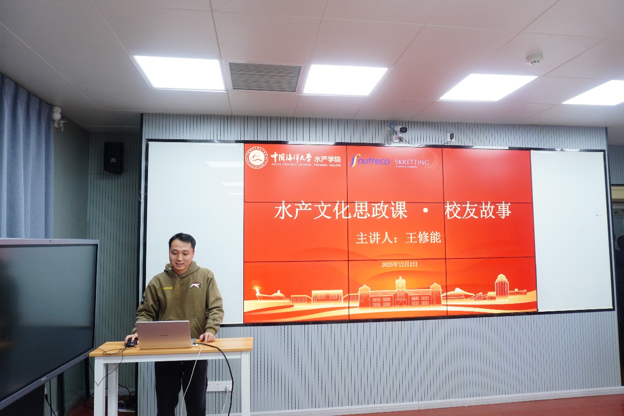 颁奖仪式结束后,水产学院水产养殖专业2023届毕业生、目前就职于泰高思凯汀的王修能为参会学生带来了一堂生动的“水产文化思政课”,他围绕行业发展趋势、职业能力培养、技术转化应用等主题,与同学们展开面对面交流,并结合自身从校园到职场的经历,为学弟学妹们提供了宝贵的就业指导与发展建议。