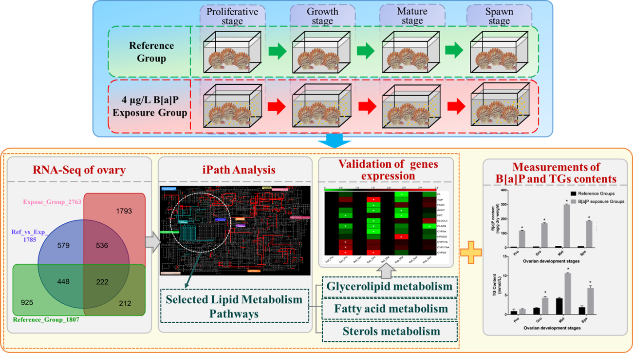 多环芳烃(PAHs)是海洋环境中广泛存在的持久性有机污染物(POPs),苯并[a]芘(B[a]P)作为PAHs中毒性最强的致癌物,对机体脂质代谢的影响已成为目前研究的热点之一。然而,作为海洋污染监测的指示生物双壳类软体动物,B[a]P干扰其脂质代谢的分子机制尚未阐明,特别是在与脂质代谢密切相关的生殖阶段。本研究利用高通量测序技术,分别对自然海水和B[a]P暴露海水培养下的栉孔扇贝卵巢进行多生殖时期的转录组测序。结果揭示了B[a]P诱导甘油三酯(TGs)积累的潜在分子机制,可能是通过促进TGs合成代谢和抑制TGs分解代谢协同作用的结果,有趣的是这种机制也发生在排卵阶段。同时,本研究测定了卵巢中B[a]P和TGs的含量,为B[a]P对双壳贝类脂质代谢的干扰效应和其阶段依赖性的积累模式提供了直接的生化证据。研究发现脂肪酸合成酶相关基因在多个生殖阶段协同下调,揭示了机体应对氧化损伤降低敏感性的代偿分子机制。此外,本研究还探讨了B[a]P影响类固醇代谢的潜在分子机制,可能会对双壳贝类的生殖功能构成威胁。总的来说,本研究填补了PAHs干扰双壳贝类阶段依赖性脂质代谢分子机制的空白,为研究双壳类生物在POPs胁迫下的适应机制提供了新的视角。