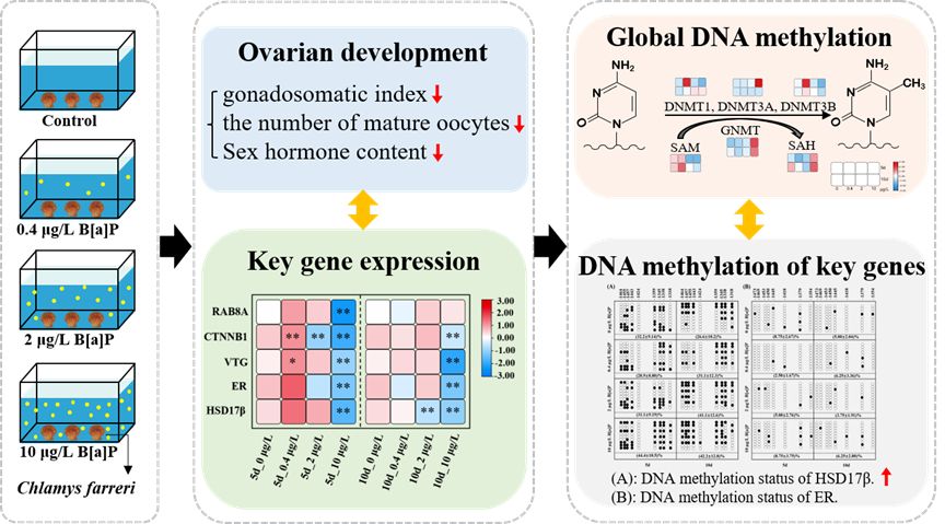 研究室在多环芳烃(PAHs)对双壳贝类生殖表观遗传毒性方面取得新进展,研究成果以Study of DNA methylation of hsd17β, er and reproductive endocrine disrupting effects in female Chlamys farreri under benzo[a]pyrene stress发表在环境科学与生态学Top期刊Environmental Pollution中科院2区,IF=9.988)。