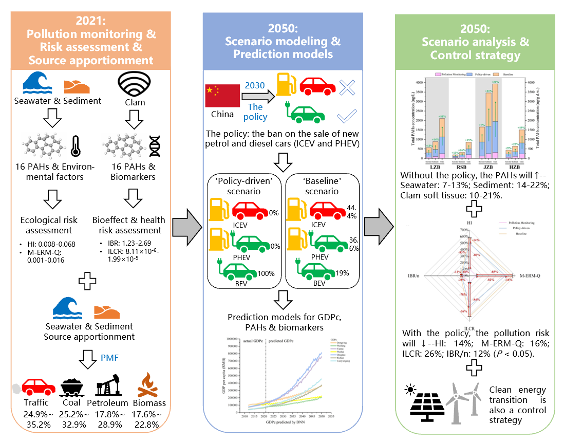 持久性有机污染物(POPs)被认为是 21 世纪影响人类生存与健康的重要环境问题。多环芳烃(PAHs)作为一种全球性 POPs,主要来源于有机物热解和不完全燃烧,具有难降解、生物蓄积性、高毒性和远距离迁移等特点。已有研究表明燃油汽车尾气排放被认为是海洋PAHs污染的重要来源,在双碳背景下燃油汽车禁售已成为必然的发展趋势,美国多个州、欧盟和我国海南省分别宣布将在 2040、2035、2030 年禁止销售新的燃油汽车。电动汽车作为燃油汽车的替代品需要消耗电力,目前我国煤电占总发电量60%左右,而煤炭燃烧也是海洋PAHs污染的主要来源,电动汽车的普及将大幅增加煤电消耗所带来的PAHs污染。因此,禁售燃油汽车对海洋PAHs 污染风险影响程度如何,这似乎还是一个“谜”,亟需通过污染风险与溯源评估揭晓这一科学问题。