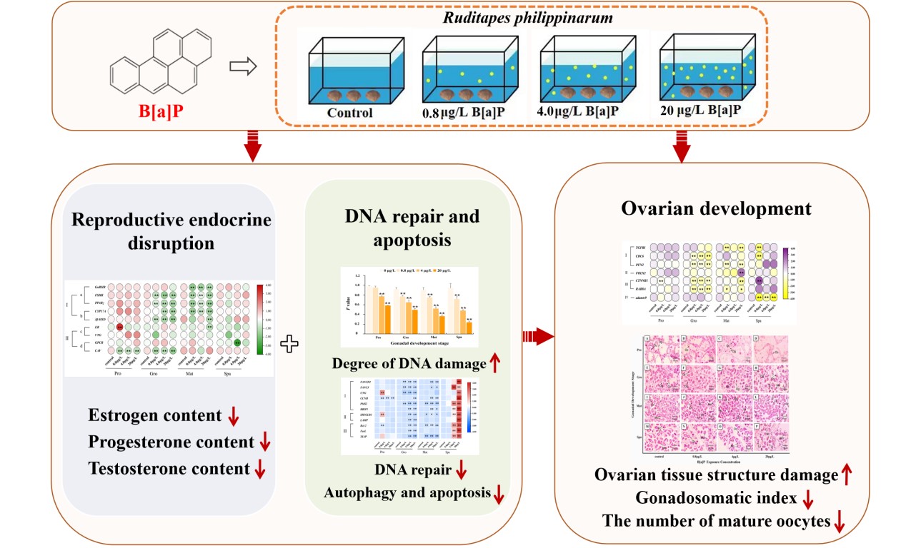 菲律宾蛤仔(Ruditapes philipinarum)是一种广温广盐性的经济贝类,主要分布于西太平洋、欧洲温带和我国南北沿岸等海区,作为海区埋栖生物群落的优势种,在食物网和生态循环中发挥重要作用,常被作为海洋POPs污染的指示生物。本文以菲律宾蛤仔为研究对象,通过设置00.8420 μg/L典型PAHs--苯并芘(B[a]P)的染毒实验梯度,探究了(B[a]P对雌性菲律宾蛤生殖内分泌干扰途径、卵巢发育毒性、DNA损伤机制。结果表明,B[a]P通过干扰类固醇激素合成和雌激素信号通路,引起性激素含量和卵黄蛋白原基因表达下降,同时B[a]P染毒造成卵巢DNA损伤,而且DNA修复和细胞自噬、凋亡均被抑制;由此在B[a]P胁迫下卵巢细胞增殖、卵子发育和卵子排出受到抑制,性腺指数和卵母细胞数量下降,呈现出明显的时间-剂量效应,产生明显的生殖毒性效应。这项研究从生殖内分泌干扰和DNA损伤两个方面,阐明了PAHs对双壳贝类的生殖毒性机制,为海洋贝类种质资源保护和PAHs污染监测提供了科学依据。