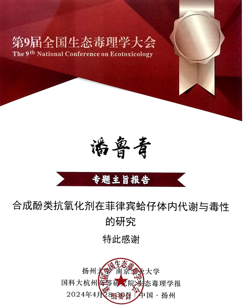 第九届生态毒理学大会颁发的专题主旨报告证书