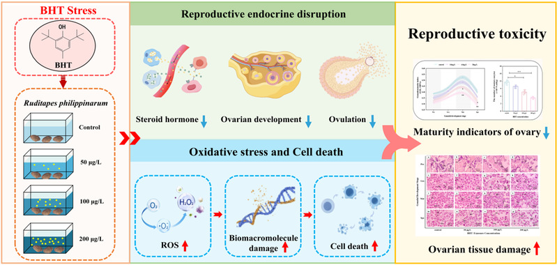 菲律宾蛤仔Ruditapes philipinarum主要分布于西太平洋、欧洲温带和我国沿岸海区,在食物网和生态循环中发挥着重要作用。本研究选择2,6-二叔丁基-4-甲基苯酚BHT作为典型SPAs,设置050100200μg/L BHT染毒梯度,探究了BHT对生殖期雌性菲律宾蛤仔的生殖毒性机制。结果表明,BHT干扰了卵巢类固醇激素合成和雌激素受体基因的表达,性激素含量显著下降,表现出明显的抗雌激素效应;BHT能抑制原始生殖细胞发育、卵子的形成过程,并通过缺氧诱导因子和金属裂解酶阻碍卵子排出,最终造成性腺指数和成熟卵母细胞数显著降低。同时BHT胁迫诱导卵巢ROS水平明显升高,造成生物大分子损伤效应,卵巢细胞凋亡、焦亡、Fe2+死亡增加,组织结构严重受损。本研究首次阐明了SPAs对水生无脊椎动物生殖毒性的分子机制,为海洋生物资源保护和SPAs污染监测提供了科学依据。