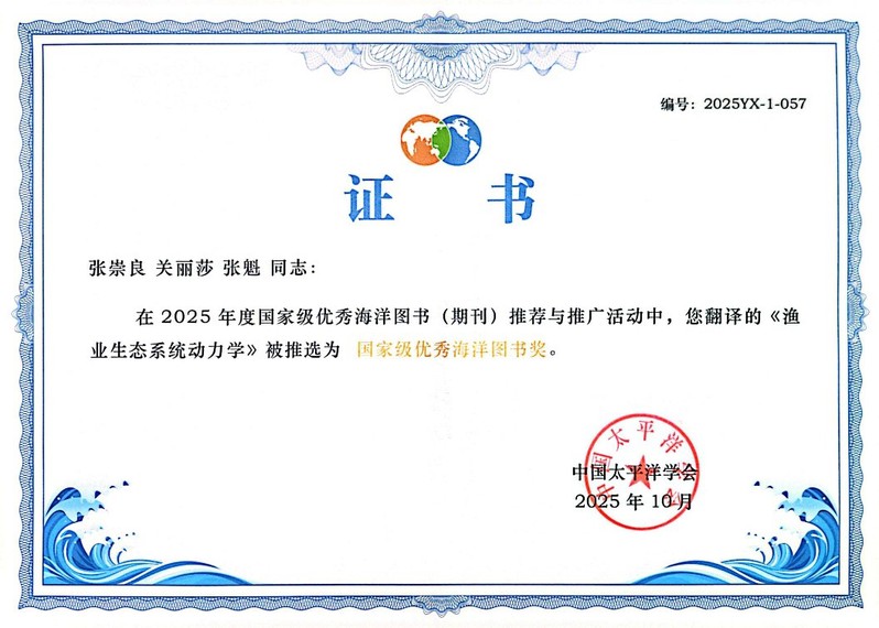 近日,中国海洋学会公布了2025年度海洋优秀科技图书名录,共有28项海洋优秀科技图书入选,本实验室出版图书《渔业生态系统动力学》(作者:张崇良 关丽莎 张魁)成功入选。
