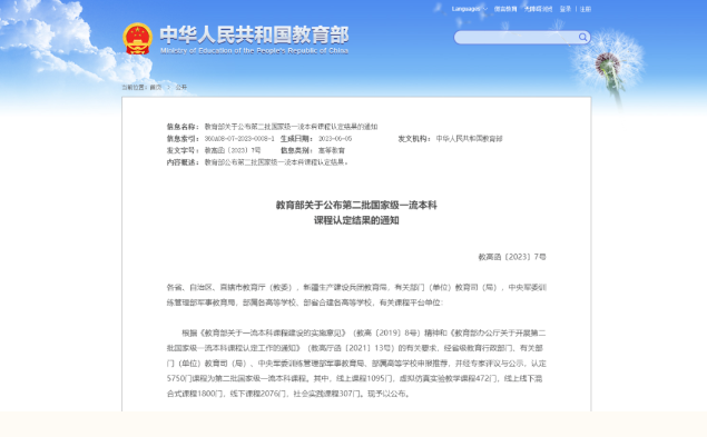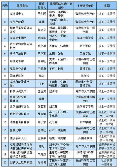 日前,教育部发布《关于公布第二批国家级一流本科课程认定结果的通知》(教高函〔20237号),中国海洋大学20门课程入选第二批国家级一流本科课程,其中线下一流课程10门,线上线下混合式一流课程4门,线上一流课程3门,虚拟仿真实验教学一流课程2门,社会实践一流课程1门。截至目前,学校共有46门课程入选国家级一流本科课程。
