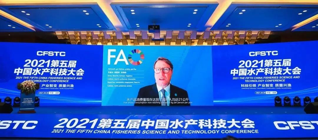 四川省农业农村厅副厅长 薛学深 联合国粮农组织水产养殖处处长Matthias Halwart通过远程连线参与第五届中国水产科技大会,和现场嘉宾一起探讨国内国际水产发展趋势。