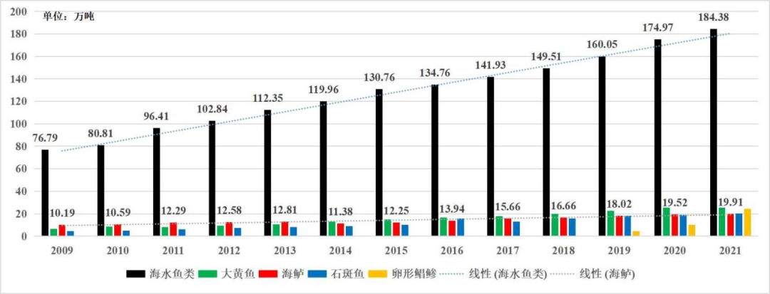 温海深:从养殖产量来看,2021年我国海水养殖鱼类总产量为184.38万吨,其中大黄鱼:25.42万吨,卵形鲳鲹:24.39万吨,石斑鱼:20.41万吨,海鲈:19.91万吨(包括1万吨左右的尖吻鲈养殖产量)(详见下图)。海鲈在海水养殖鱼类中产量始终名列前茅,2009年以来,我国养殖海鲈年产量均超过10万吨,珠海地区池塘海鲈养殖产量占全国总产量一半以上,是我国海鲈养殖与加工主产区。