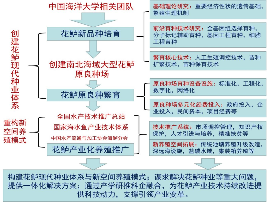 温海深:这是一个庞大的系统工程,并非一个单位、一个企业就能足以支撑,所以产业的力量需要集中起来,整合全国的高校、科研院所、种业相关企业,推广部门、协会等力量,重构“新空间”养殖模式,创建花鲈现代种业体系(详见下图)。同时,我们中国海洋大学也在积极联合各方力量,共同推动产业。目前,我们在山东省就有两家深度合作的海鲈育种企业,他们分别是利津县双瀛水产苗种有限公司和烟台经海海洋渔业有限公司。