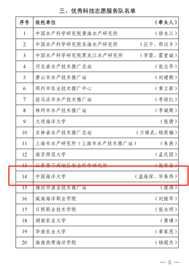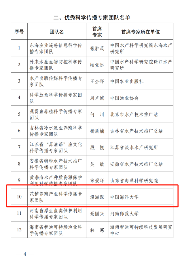 近日,中国水产学会公布了2024年度科普和科技志愿服务工作优秀名单,由本实验室温海深教授任首席专家组成的“花鲈养殖产业科学传播专家团队”获评“优秀科学传播专家团队”,依托中国海洋大学建设的科技志愿服务队被评为“优秀科技志愿服务队”(牵头人温海深、毕春伟)。 花鲈养殖产业科学传播专家团队依托所在的海水养殖教育部重点实验室功能实验室-鱼类繁殖生理与种子工程实验室、中国海洋大学水产学院、全国水产技术推广总站、中国农业出版社、广东珠海市、福建福鼎市、浙江宁波市等相关合作单位,积极组织开展花鲈科普活动。团队成员时常深入乡村基层,走进养殖户,为养殖户提供切实有效的技术支持;积极开展科普活动,通过讲座、培训等形式,向广大群众普及花鲈养殖知识。同时,团队还通过微信公众号、实验室网站、科技小院管理服务平台等途径发布花鲈养殖产业相关科普视频、科普图文等。有效推动了花鲈科普工作。中国海洋大学科技志愿者团队由鱼类繁殖生理与种子工程实验室及渔业设施团队相关人员组成,在鱼类深远海养殖、品种选育、养殖等方面进行技术服务,1年来取得显著成效。 中国海洋大学相关团队将获此殊荣为契机,继续开展花鲈科普工作,持续提供高质量水产科普产品和服务,为助力实现高水平科技自立自强作出新贡献。