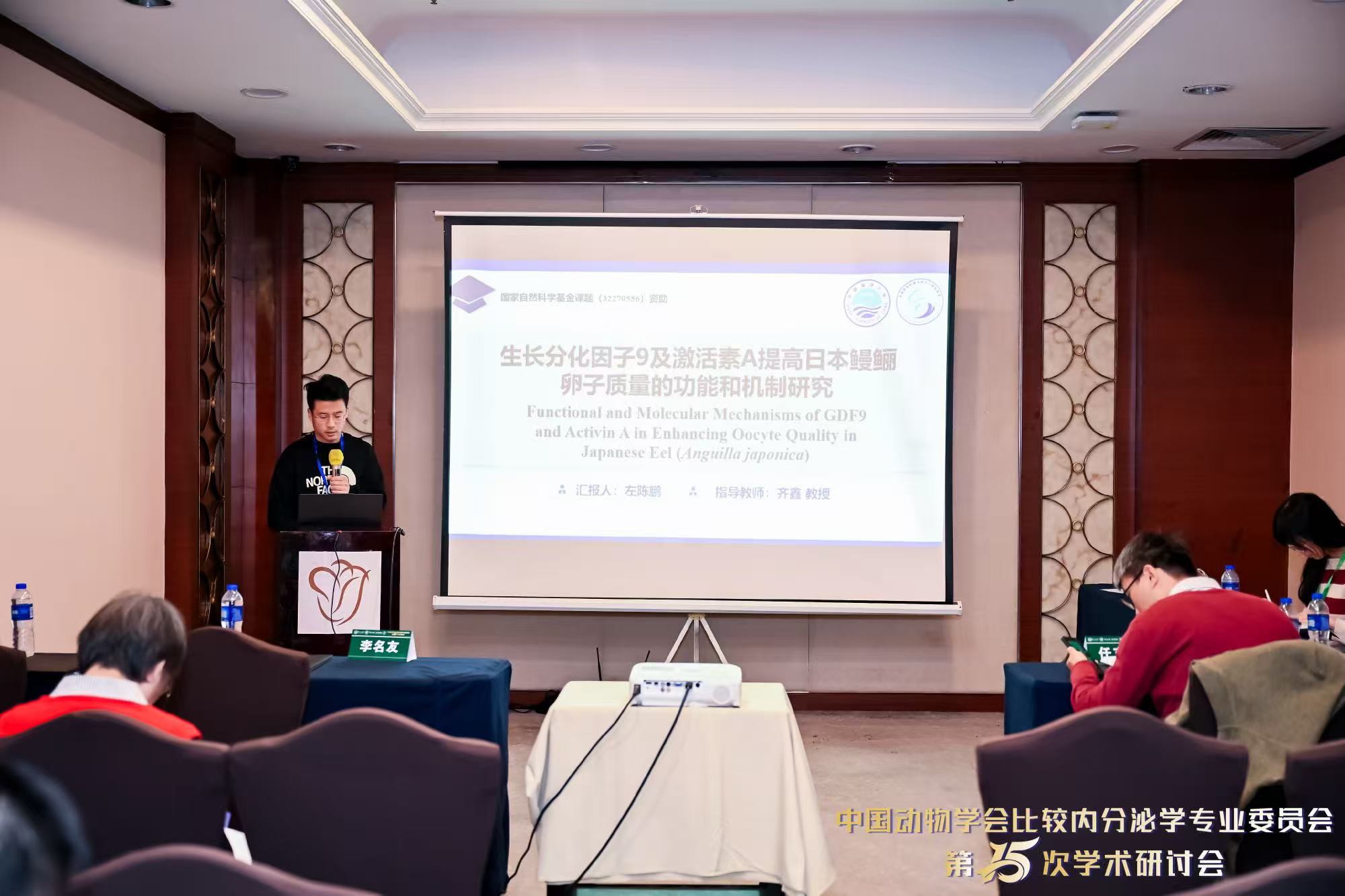 30日上午,温海深主持第二场专题报告,并与专家进行交流。30日下午,大会设置研究生学术报告专场,实验室3位研究生作口头报告,展示了课题组在鱼类内分泌与生殖调控方面的最新进展。其中,博士生左陈鹏作题为《生长分化因子9和激活素A提高日本鳗鲡卵子质量的功能及机制研究》的报告;博士生杨晶汇报了《RNAi介导的肌抑素敲低可改善花鲈肌肉质量》的研究成果;硕士生杨欣琳则以《卵胎生硬骨鱼许氏平鲉妊娠维持机制解析》为题介绍了相关工作。三位同学报告内容充实、思路清晰,展现了实验室青年学者良好的科研素养。