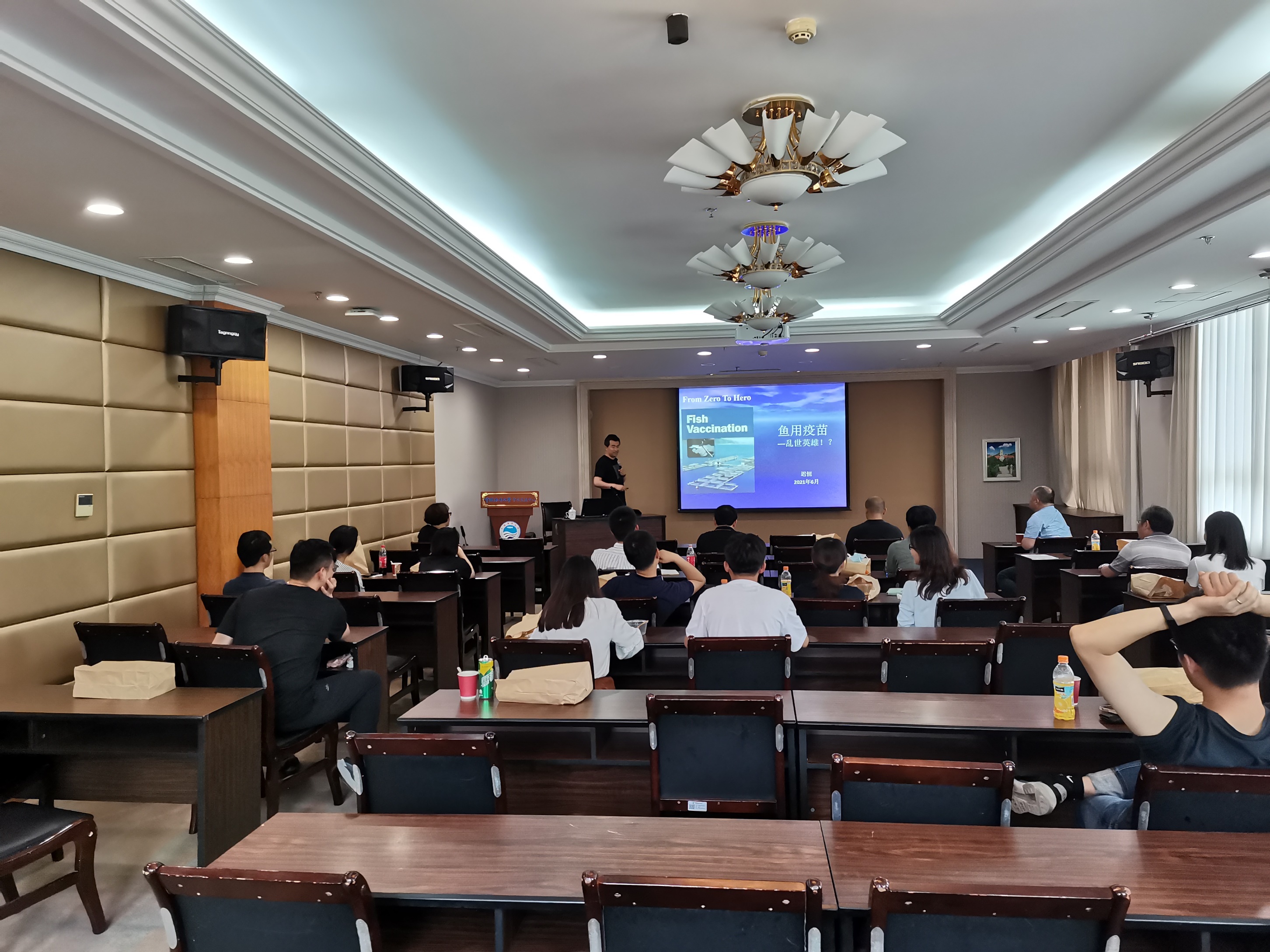 迟恒教授以“鱼用疫苗-乱世英雄!?”为题,结合了自己的科研经历,系统介绍了目前鲑鳟鱼类疫苗的应用现状,分析了挪威鱼类疫苗自上世纪90年代大规模推广应用后,抗生素的使用量显著降低,保障了20多年来挪威鲑鳟鱼养殖业的健康发展。针对国内鱼类养殖现状和存在的问题,阐述了自己的观点、设想和解决方式,并与参会老师对虹鳟鱼的健康养殖进行了探讨。