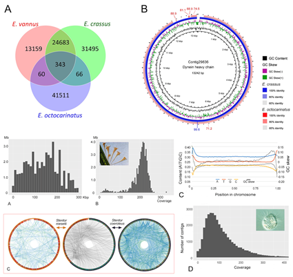 纤毛虫组学及基因进化 主要聚焦海洋养殖危害类群、系统地位特殊类群、环境极端类群等开展组学信息库的构建和分析,并针对其独特的两型核结构,研究其接合生殖过程中的基因组重组模式及机制,并对该过程中所涉及的基因及其功能进行揭示。本工作为真核生物基因组进化及功能基因的研究等提供重要的理论支持和分子生物学信息。