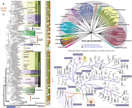 纤毛虫的分子系统学 主要涉及利用标记性基因测序、二级结构分析、系统树构建、基因组系统学分析等手段,对各类纤毛虫原生动物的系统发生与演化、阶元间的关系以及在系统发育树中的地位探讨。此外,该方向的工作还包括对海洋类群的DNA种库的完善构建。本领域的研究将为纤毛虫系统发育、进化以及基因组学等学科研究提供基础信息。