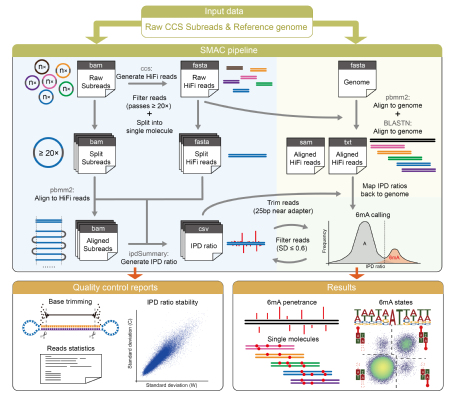 2025年4月9日,中国海洋大学海洋生物多样性与进化研究所原生动物学团队在权威生物信息学期刊Briefings in Bioinformatics发表研究成果“SMAC: identifying DNA N6-methyladenine (6mA) at the single-molecule level using SMRT CCS data”,搭建了一套基于三代测序数据检测DNA 6mA甲基化修饰的分析流程。