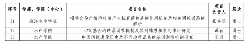 根据《中央高校基本科研业务费专项资金中国海洋大学项目及资金管理办法(修订)》(海大字〔201627号)和《关于开 展2022年中国海洋大学研究生自主科研项目申报工作的通知》 (研院字〔2022〕144号),经个人申请、研究生院审查、专家评审等环节,本年度研究室同学获得项目情况如下: